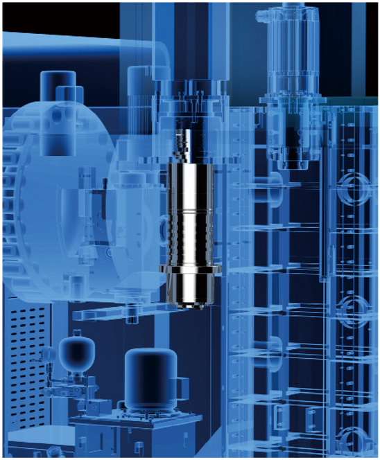 箱型主轴头结构,内部筋骨强化,采用 P4 级超精密斜角滚珠轴承及大跨距支撑设计,使主轴能够承受强大的径向和轴向推力, 消除重负荷切削下产生的震动;